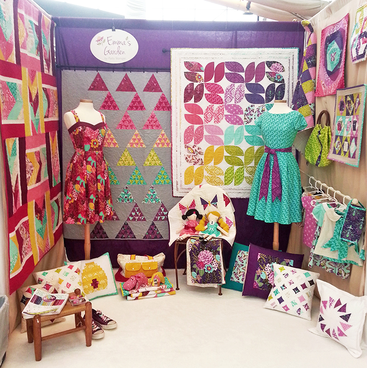 I did manage to walk the floor a bit and snap a few quick drive-by pics. I was pretty excited to visit Violet Field Threads to check out their new clothing patterns and found out that they’ve used some of my fabrics on the cover of one of them! Can you find it?