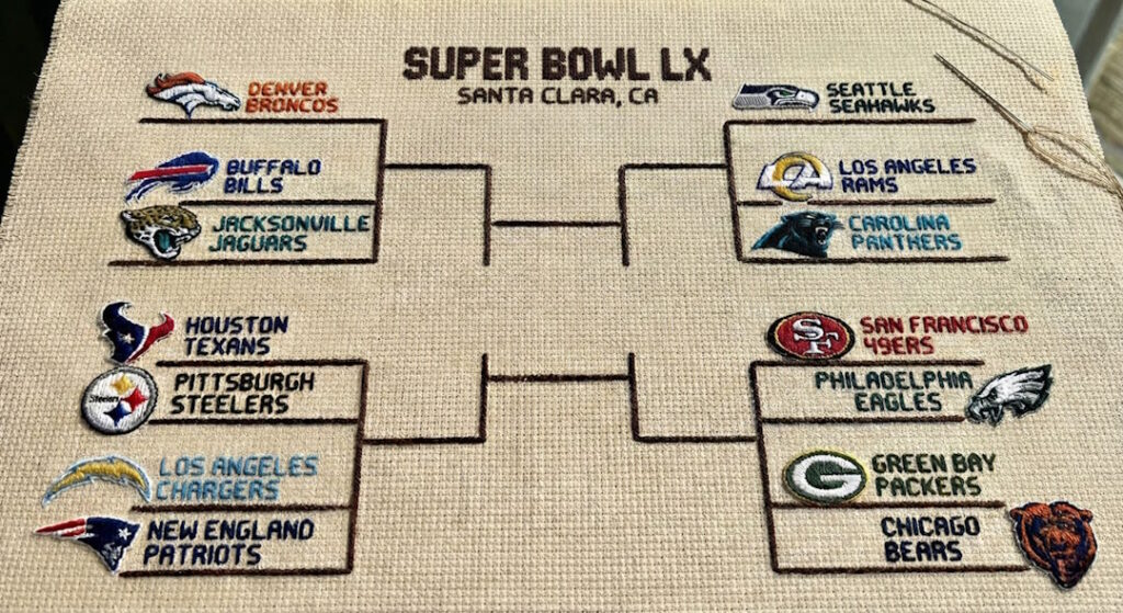 Most sports crafts are “static” — you stitch a logo, frame it, and call it done. A playoff bracket piece is different: it’s living art. You start with a clean, empty post-season roadmap, then update it as the NFL story unfolds week by week.